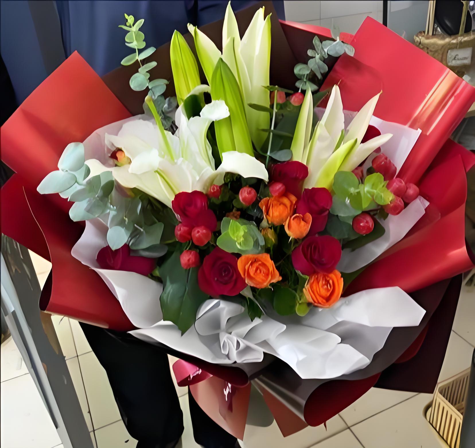 绵阳江油市花店包11枝红玫瑰、2枝多头白百合、6枝橙色多头玫瑰、红豆、尤加利叶